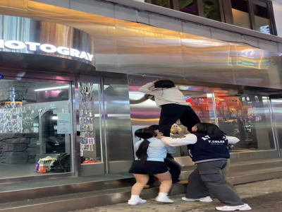 인생네컷 사진 붙이는 여고생들